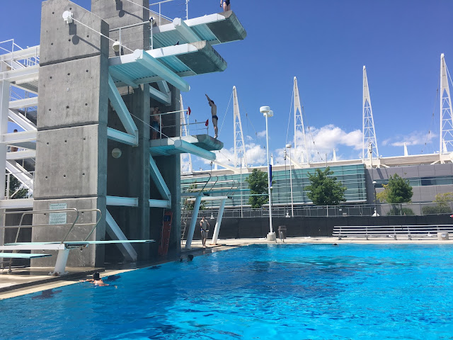I spent a little too long at my dad's house and had to hurry and get the boys ready to go to diving. We were late because I needed to stop by the store for sunscreen on the way. I thought we had some...whops. The boys got to dive on the platforms today. Well Stockton did. Preston just stayed on the 1 meter. He finished a little earlier than Stockton but didn't want to jump off the platforms. He said the water was too cold!